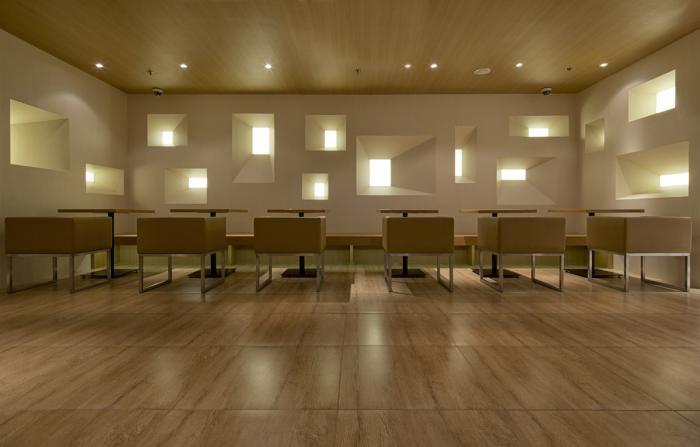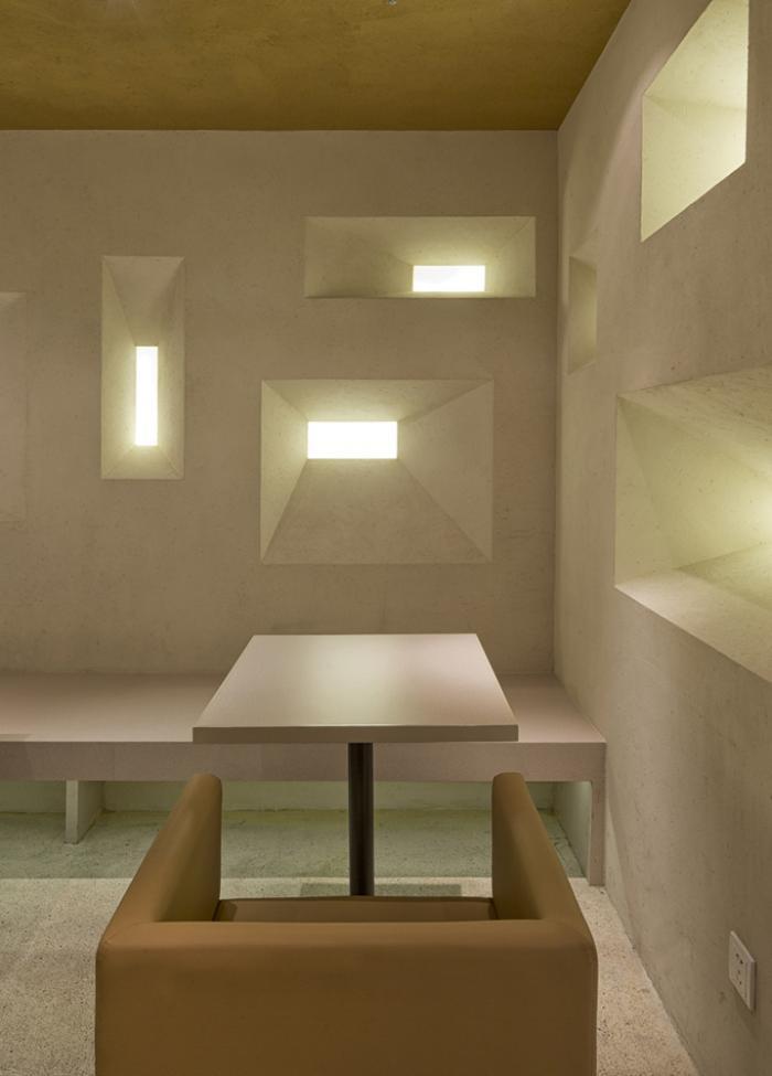 そこで、ナナズグリーンティー上海香港名店街店では、壁、床、天井、机、椅子、ベンチを1つの素材で作り、「木の茶室」「土の茶室」「石の茶室」の3つの茶室を表現する。