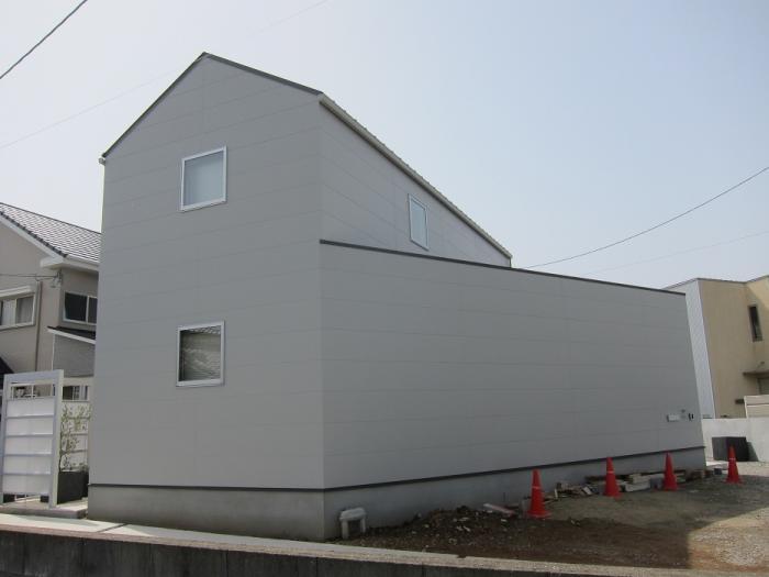 シンプルモダンな木造住宅です。三角屋根の外観に斜めに伸びる壁を設ける事で、建物に動きを与え飽きのこないデザインにしています。