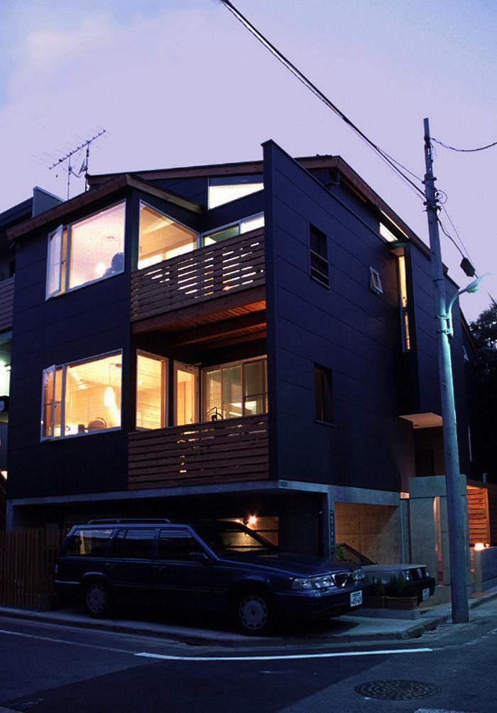 敷地26坪、幅4m未満の道路と3方向の斜線規制など、都心らしい厳しい敷地条件の中、独立3世帯に2台分の車庫とバイクガレージも備えた、空間を高効率利用した都市型住宅です。
