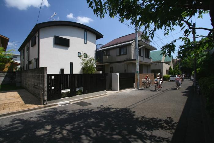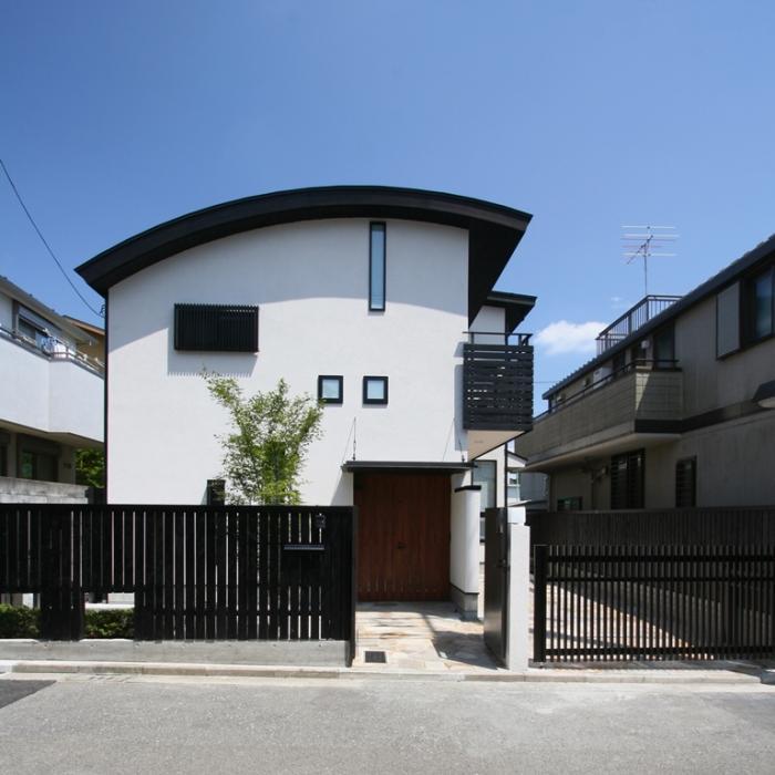 アーチ状の屋根は、北側斜線(高度地区斜線)の関係で建物北側の高さを低く抑えながらも、室内の空間はできるだけ高さを確保すべく考えたものです。これは日本古来のむくり屋根に通じるもので、街路に対して柔らかなたたずまいの家とすることができたと考えています。