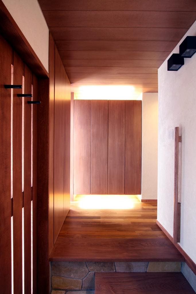 正面の収納棚の上下は間接照明とすることで、柔らかな光に包まれる玄関です。
