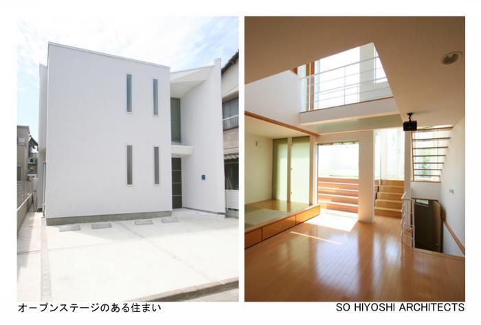 音楽がご趣味のご主人様より、気兼ねなくドラムが叩ける多目的スペースをとのご要望を受け、敷地南側に主要な住宅部分と離した形で、半地下の防音室を設け、その上部を1階リビングに面した外部デッキテラスとし、スキップフロア状に大階段で繋ぐことにより、あたかも野外のミニコンサートスペースとなるようなオープンステージを創造しました。