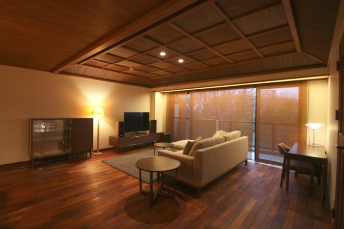 熱海にある古いリゾートマンションのリノベーションありきたりの和室と居間がつながる間取りを一室としてアジアンリゾート風の雰囲気を目指している
