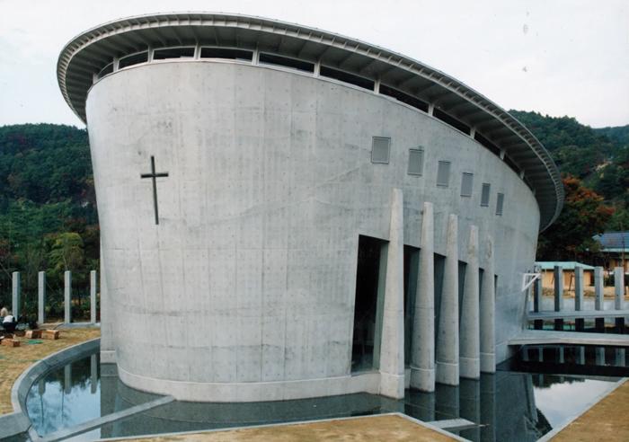 ホテルの敷地内に新築したキリスト教式の結婚式を行うウェディングチャペルです。楕円形の平面に、7度傾いた3次元曲面の外壁が特徴です。