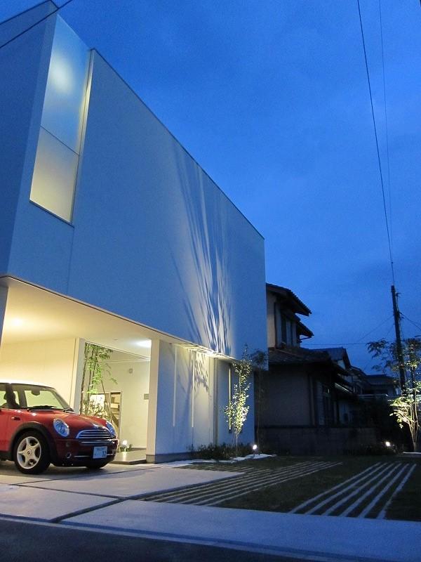 シンプルモダンな白い箱型な家。ビルトインガレージと中庭及びルーフバルコニーがありプライバシーを確保された住まい。ダークブラウンとホワイトを基調としたナチュラルでシンプルな空間をご希望。