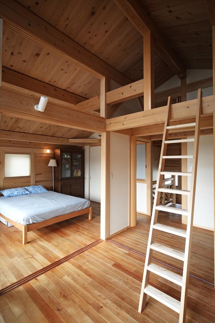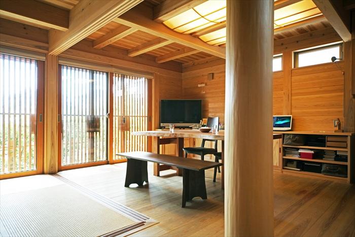 外観は普通の家でも、内部はログハウスのように、床、壁、屋根を厚い板=あぜくら板で包み