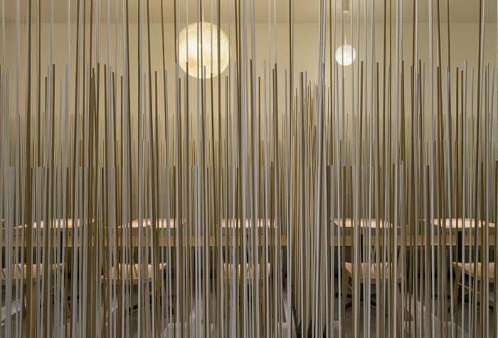 実際は、地面に毛氈というマットをひき、屋外との心理的な境界を設けるが、今回はインテリアの中で野点を体験する為に、すすきに見立てたグラスファイバー製の棒を無数に立てることによって「自然」を設計し、野点に必要な心理的な「境界」を設計した。