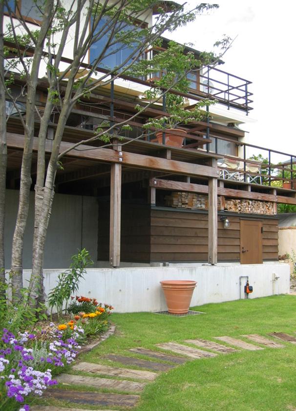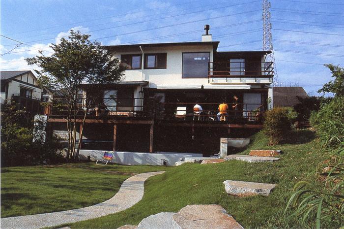 眺望と敷地の有効利用を考え、建物はひな壇上に配置、敷地東側の崖の開発法面を活かした造園を行い、建物と庭を連続性させました。