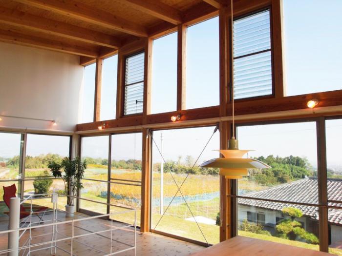 2階リビング。大きな開口部は周辺の風景と空を取り込みます。