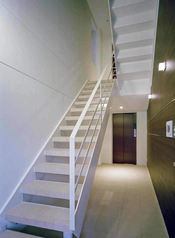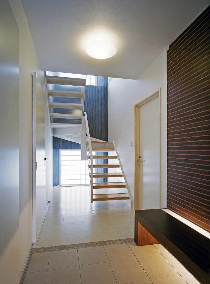 階階段室兼エントランスホール 階段の蹴上げ部分に半透明の材料を使い、コンパクトな空間で広がりを感じさせる工夫を凝らしました