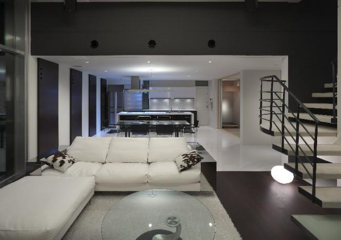 そこで建物の部屋を奥様ゾーンと旦那様ゾーンに分けてイメージを変える事にしました。しかし、がらりと変えるとちぐはぐなデザインとなるので、基本は落ち着いたモノトーンとし、細かなテイストで雰囲気を変えるデザインとしました。