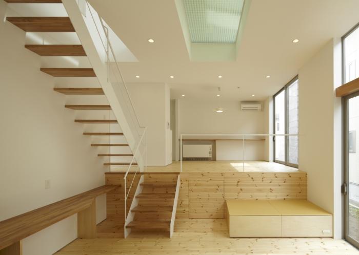 リビングの天井の一部には,40mmのFRPグレーチングとポリカーボネートを重ね合わせて,光が透過する部分を設け,2階の光が1階リビングへ降り注ぐようにしました.FRPグレーチングとポリカーボネートを透過することで,光は淡く変化し,リビングを演出します.床は無垢のパイン材とし,自然塗料である蜜蝋ワックス仕上げとしたことで,パイン材本来の柔らかさ・温かみを生かすようにしました.床のパイン材は,リビングからダイニングへの立ち上がる壁部分にも張り伸ばし,スキップフロアをより連続した空間に感じられるように仕上げました.