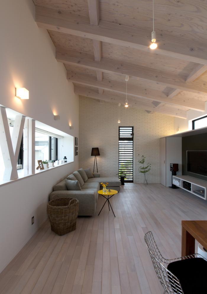 リビング正面の壁にはレンガを貼っています。天井には構造用合板、床には無垢材を貼りどちらも白く塗装しています。