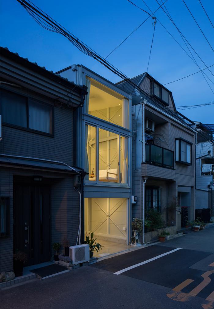下町の狭い間口の土地に建つ住宅です。限られた敷地の中で、上下階の移動を単なる制約としてではなく様々な性格を持つ空間のつながりとして楽しめるよう、1つのハコの中に6つの「」型の床面をつくり、半階ずらしながら積み重ねることで止まり木を移るような生活が送れる住まいを計画しました。敷地を最大限有効活用するために内・外装を兼ねた断熱材入りサンドイッチパネルを隣地境界際に立てて鉄骨の柱梁をそのまま露出、倉庫の中に暮らすような住まいになりました。南面の大きな開口とルーフテラスから太陽光を家全体に取り入れつつ、透過性の異なる3種類のカーテンによって時間や用途に応じてプライバシーを調整できます。