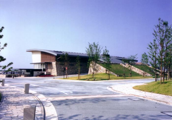 駐車場側は屋上緑化された斜面で建物が隠されている