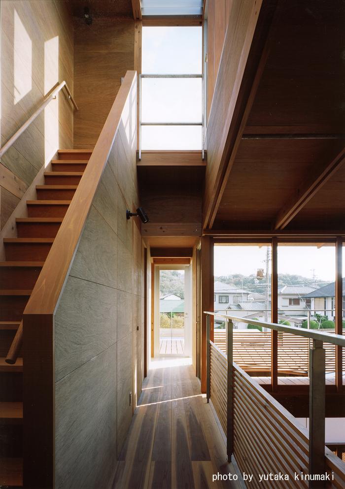 リビング吹抜け上の通路より外につづくデッキをみる。