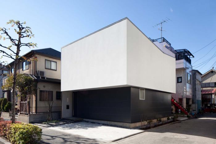 黒い外壁の上に張り出した白い2階外壁
