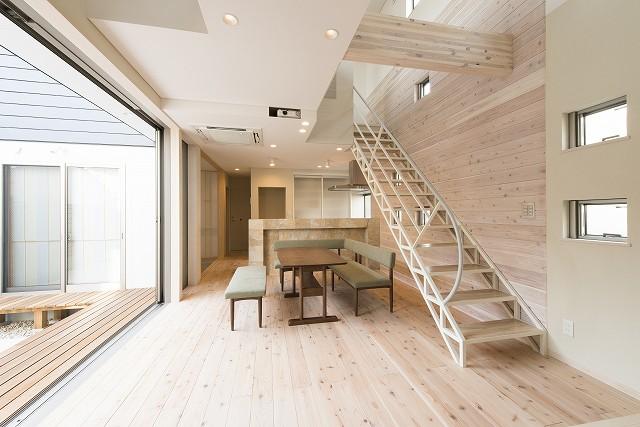 LDKを見る。左側は外部のウッドデッキとライトコート(中庭)。