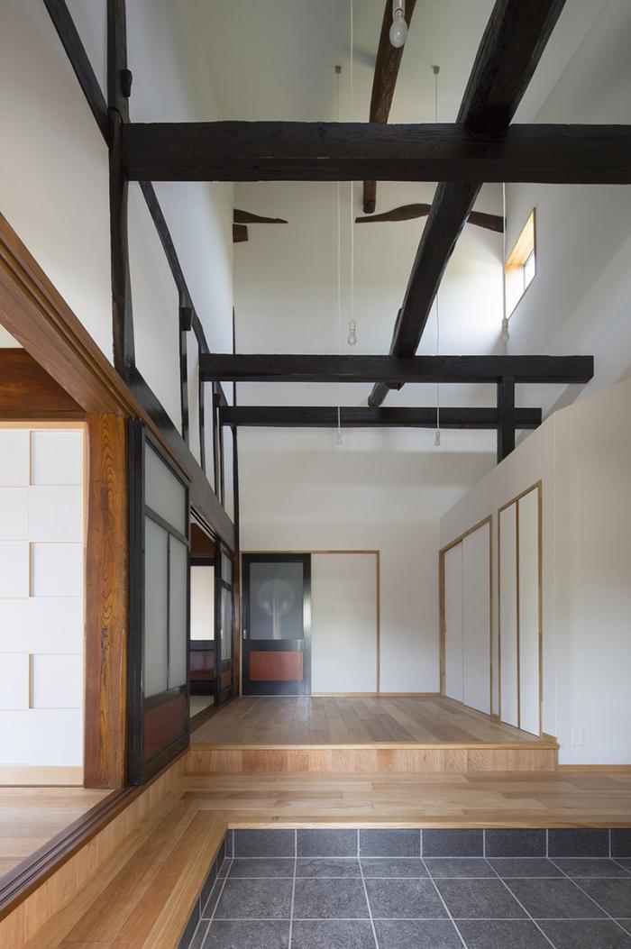築65年程経つ民家の全面リフォームです。外装は劣化が激しかった為、一部のアルミサッシ以外、屋根瓦、外壁を含め、全てを取替えています。内部は既存の柱や梁を意匠的に生かしつつ、元々の居室広さを有効的に使用出来るような平面計画とし、自然光をLDKにも多く取入れるように一部減築して中庭テラスを計画しました。内外共に古民家の印象は残しつつも現代風の要素を取入れています。