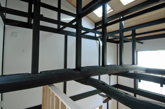 外観は全くの新築に見えますが、内部は古いゴロンボを用いて、レトロ感のあるインテリアとなっています。ケヤキの古材の柱のホゾが、この家のコンセプトを明快に表しています。