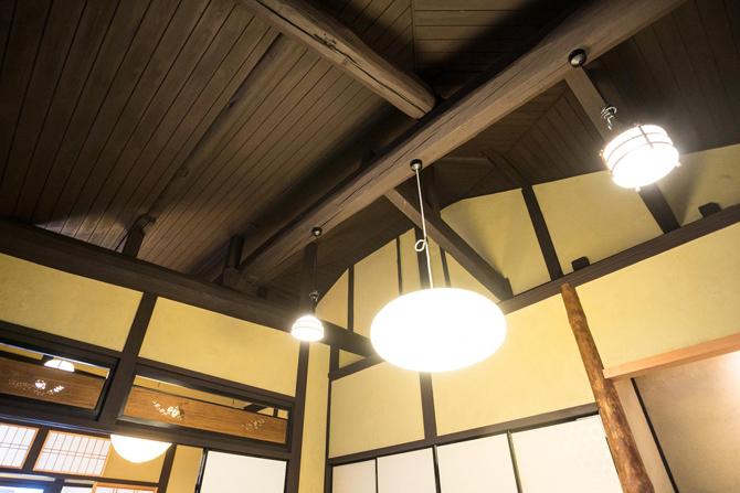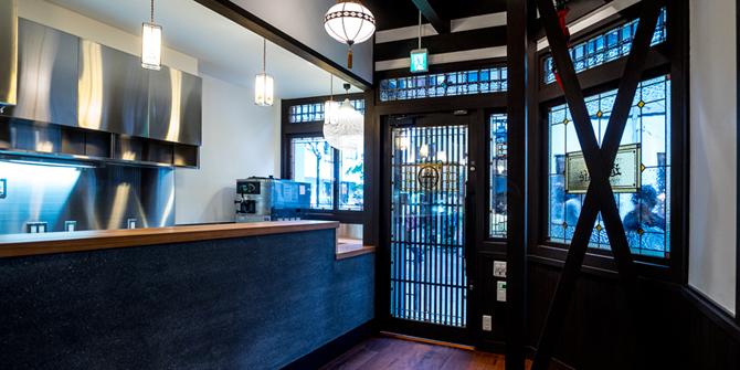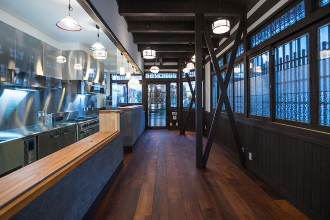 大正レトロを彷彿とさせる戸夢窓屋さんのステンドグラスの起用と、建具の枠にベンガラ塗りを施すことによって、古くて新しい町家再生が強く強調されました。
