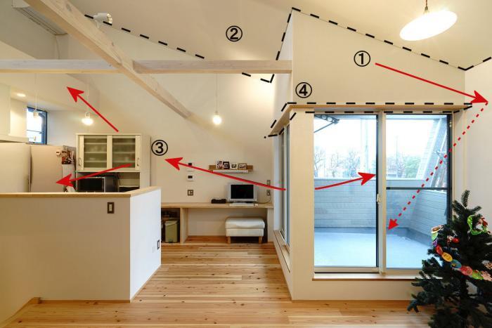 ①「そらまどのいえ」は南側隣地に東西に長いアパートが建っていて南からの日射と通風を得難い条件でした。そこで南側アパートの影響を受けない2階壁上部の高窓から日射と通風を得るよう考えました。都心の住宅地では2階レベルまでは隣家の影響で風があまり流れていません。ですが2階屋根上の高さには1年を通じて安定した風が流れています。その安定した風を得ながら建物内部の圧力差を利用した自然換気も促すよような高窓です。高窓の上には夏の日差しは遮り冬の日差しだけを取り入れる庇を設けています。