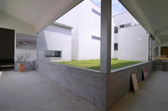 奥に引き込まれた住宅部分の変形中庭。住宅部分の採光と通風に一役買っている。