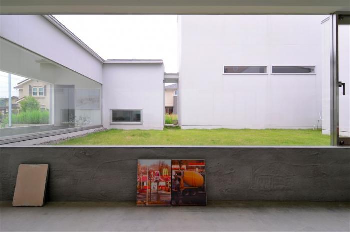 南側が公園に面した、比較的ゆったりとした住宅街の一角に位置する住宅。 南面はしているが奥行のある敷地形状のため、敷地手前と奥側の双方に採光と通風を確保することが設計の手掛かりとなった。敷地手前の趣味室は床を少し掘 り下げて建築高さを抑え、奥側の建物に光が届くよう配慮している。少し下がったレベ ルにある趣味室と、ちいさな空間を繋ぎあわせた住宅が、変形中庭を介して緩やかに繋 がっており、移動とともに変化する空間体験を楽しむことができる。