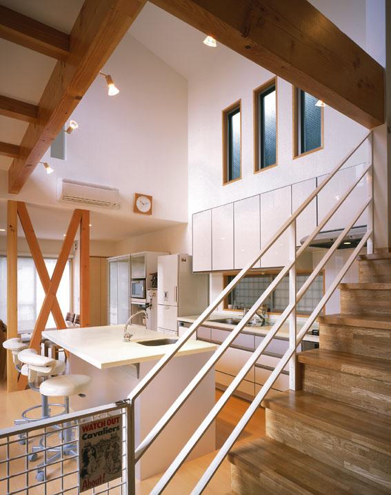 キッチンの上部が吹き抜けと言う珍しい空間を作りました。