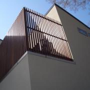 南面にご両親のお住まいがあるため、敢えて対面する面には大きな窓を設けず、ハイサッシで外光を取入れました。2階に広めのテラスを設け、木製ルーバーで祭礼時と敷地内のご両親の住まいと、緩く区切り、プライバシーを保ちつつ外部との繋がり、採光を確保しています。 |