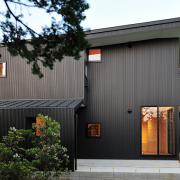 古い木造校舎のようなイメージをお持ちでしたので、外壁は既製品ではない下見板張りとし、その上に灰汁塗りを施し(施主施工。私もお手伝いしました)経年変化を楽しむ仕上げとしました。 |