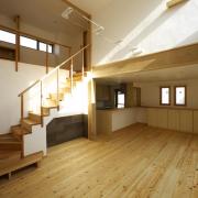 リビングに階段を取り込み、吹抜けをクッションに2階の個室との繋がりと1階全体に光を取り入れる空間を提案。 |